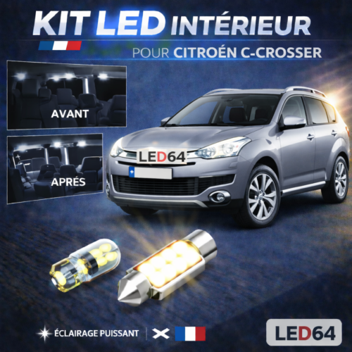 Toutes les ampoules à LED blanc pour Citroën C-Crosser, kit éclairage intérieur, ampoules feux de position, feux de plaque, éclairage plafonnier, éclairage boîte à gants, coffre, bas de porte, sol/pieds, miroirs de courtoisie …