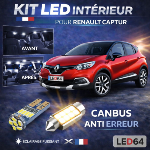 Toutes les ampoules à LED blanc, pour Renault Captur, kit éclairage intérieur, ampoules feux de position, feux de plaque, éclairage plafonnier, éclairage boîte à gants, coffre, bas de porte, sol/pieds, miroirs de courtoisie …